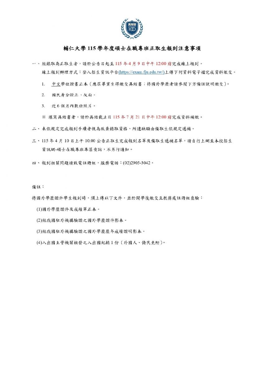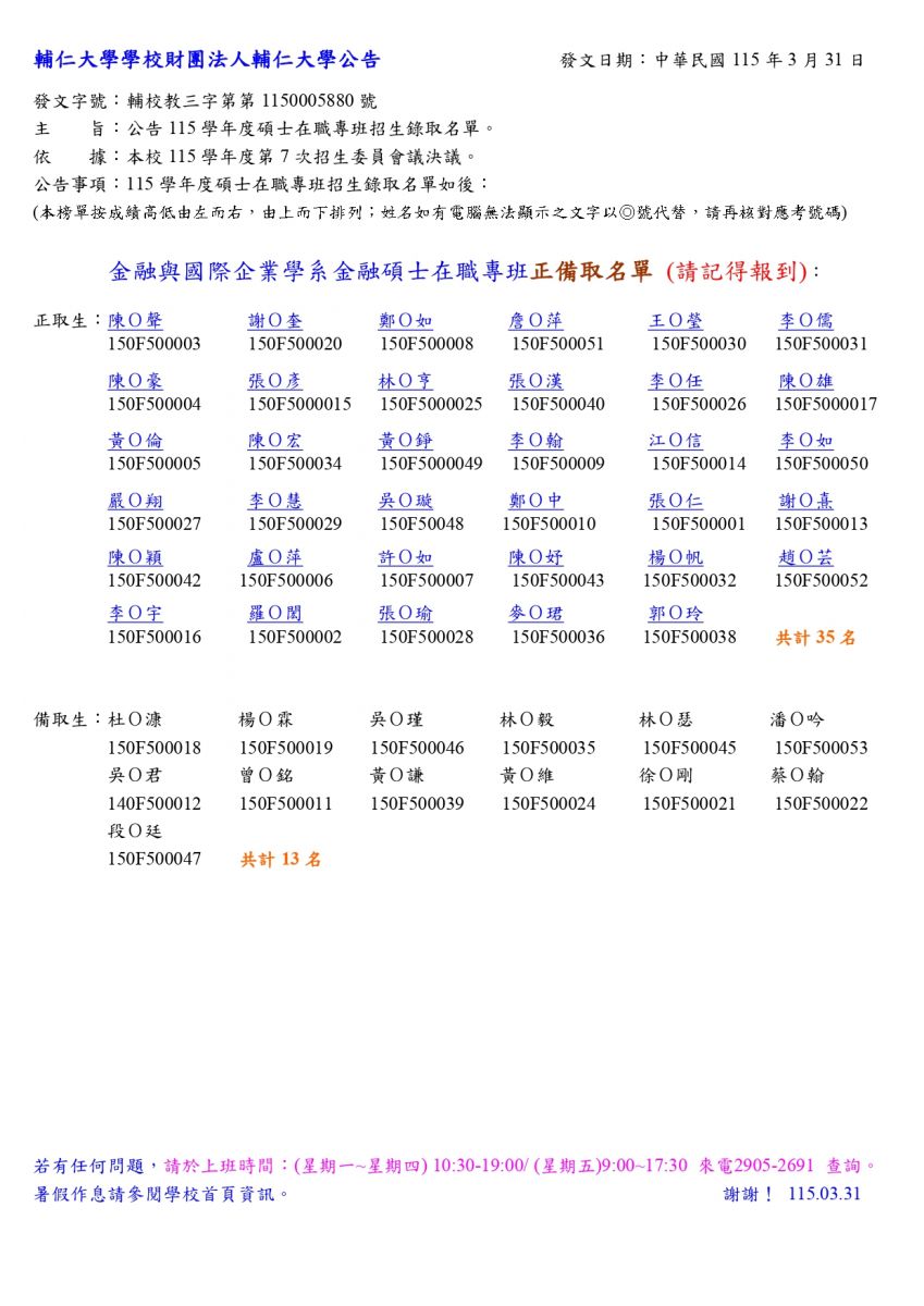 114學年度 最新消息 113學年度 112學年度 111學年度 110學年度 109學年度 108學年度 106學年度 107學年度 最新消息 首頁 最新消息 最新消息 恭喜! 115學年度金融碩士在職專班招生榜單 2026.04.01 發文字號:輔校教三字第第1150005880號 主 旨:公告115學年度碩士在職專班招生錄取名單。 依 據:本校115學年度第7次招生委員會議決議。 公告事項:115學年度碩士在職專班招生錄取名單如後: (本榜單按成績高低由左而右,由上而下排列;姓名如有電腦無法顯示之文字以◎號代替,請再核對應考號碼) 榜單如下: Top Back